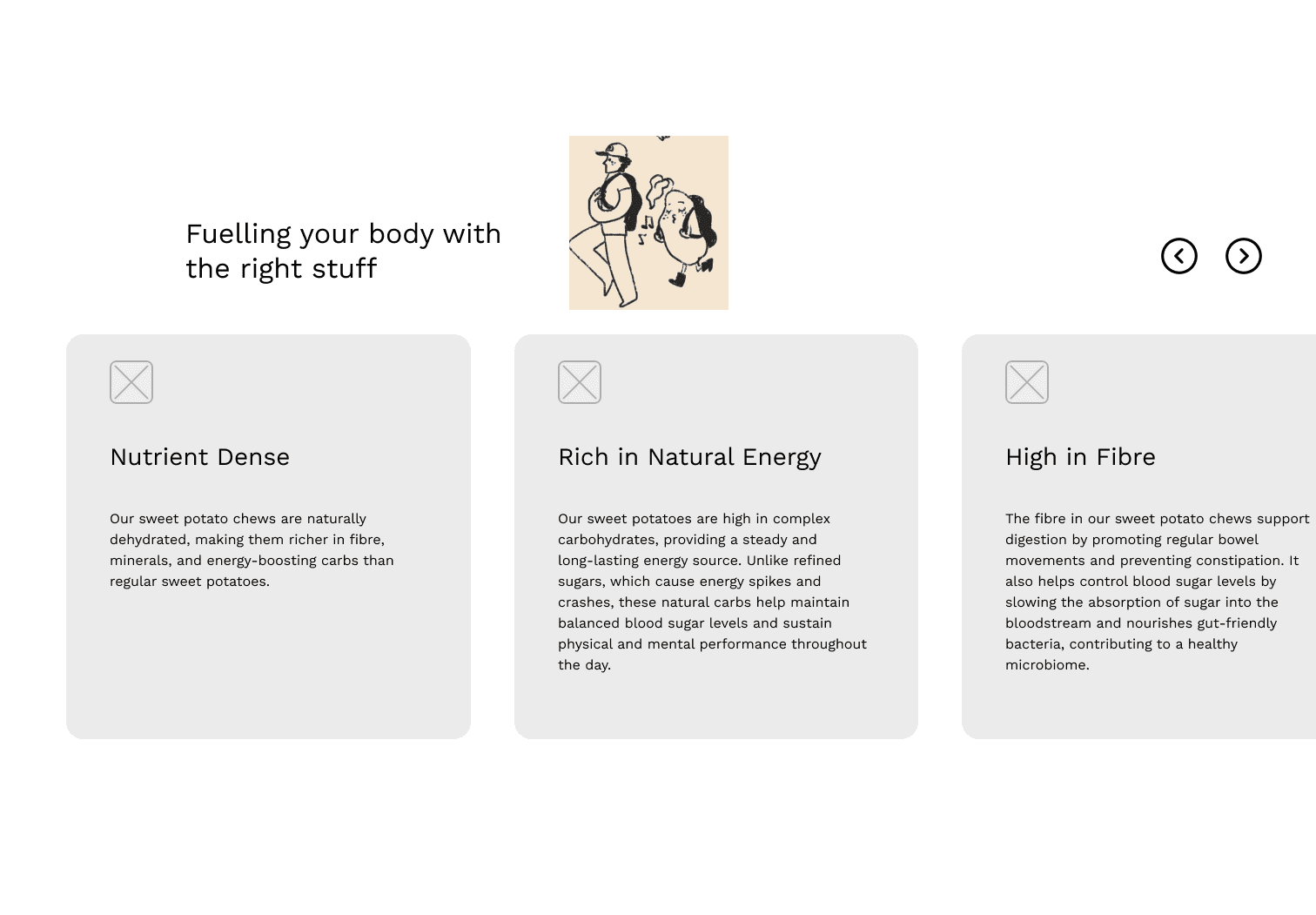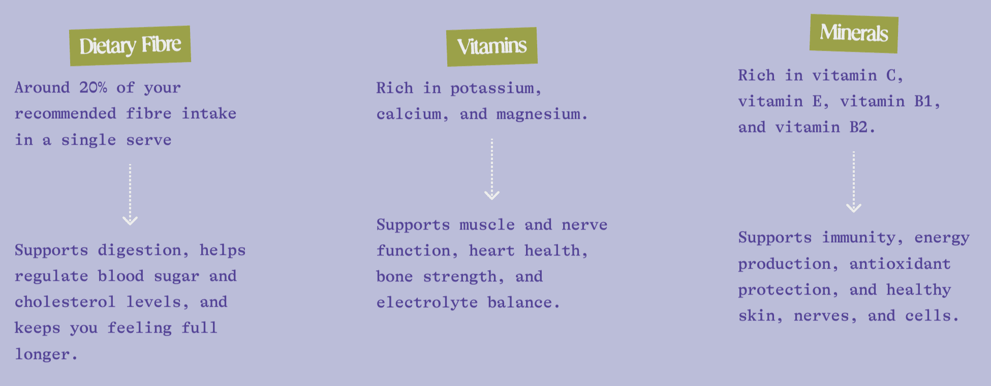 Communicating the nutritional value in small, compartmentable sections enhances user understanding and reduces the cognitive load needed to read larger sections of text. Each nutritional fact is broken down into two sections, one explaining quantities of each health benefit, and the second showing exactly what the health benefits are.