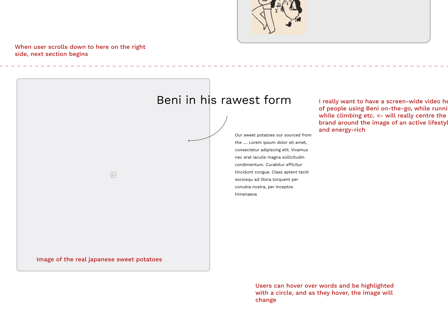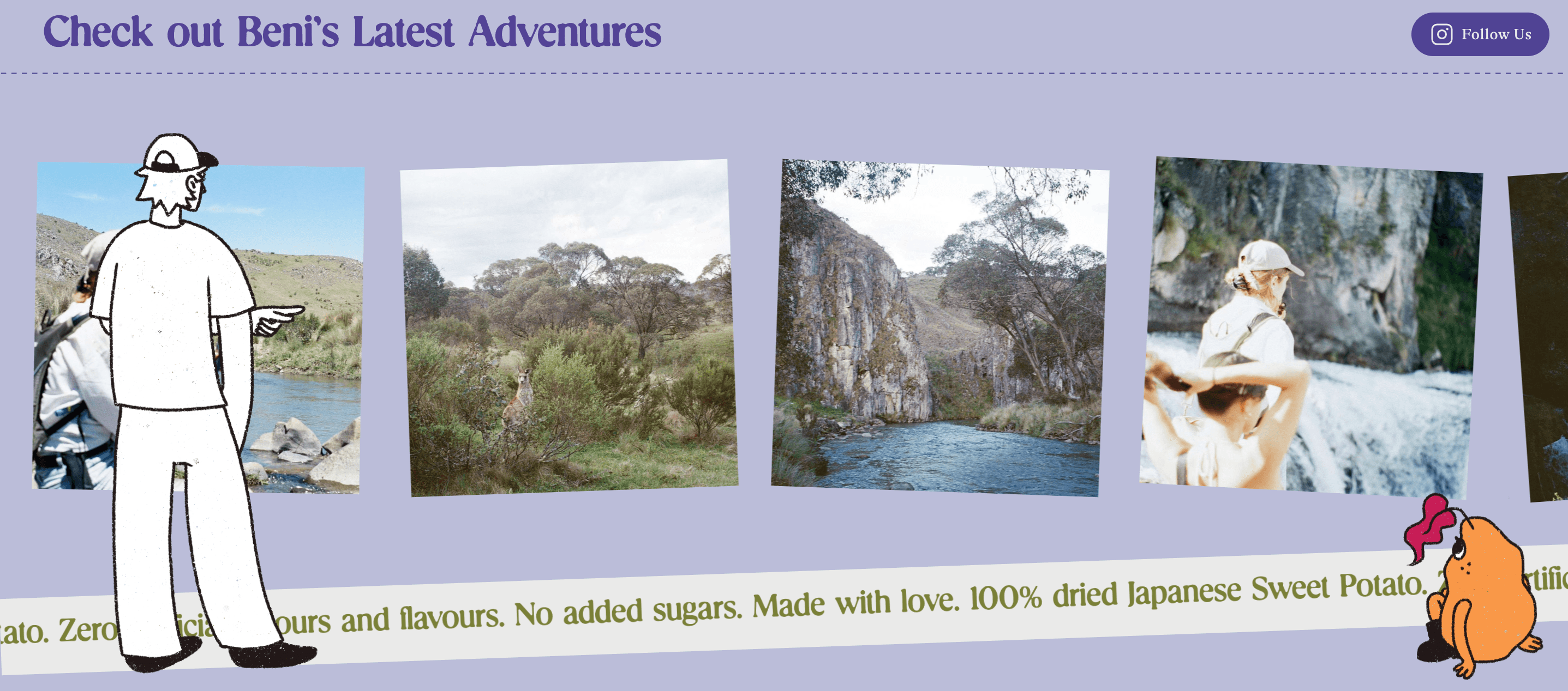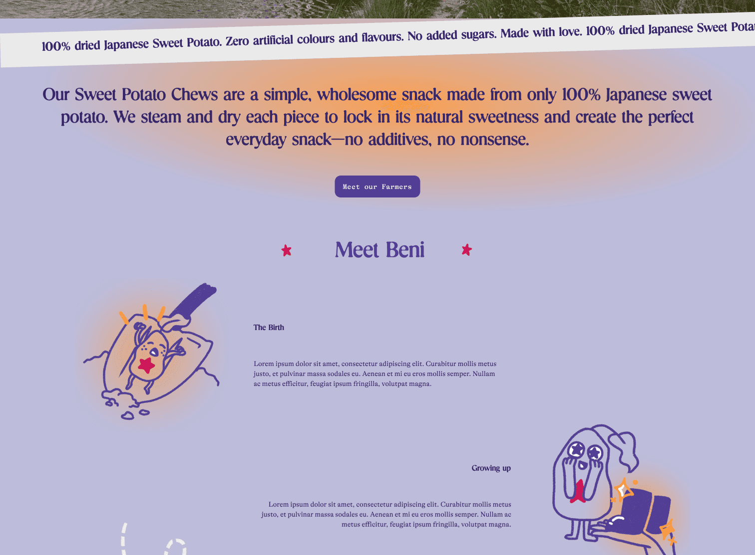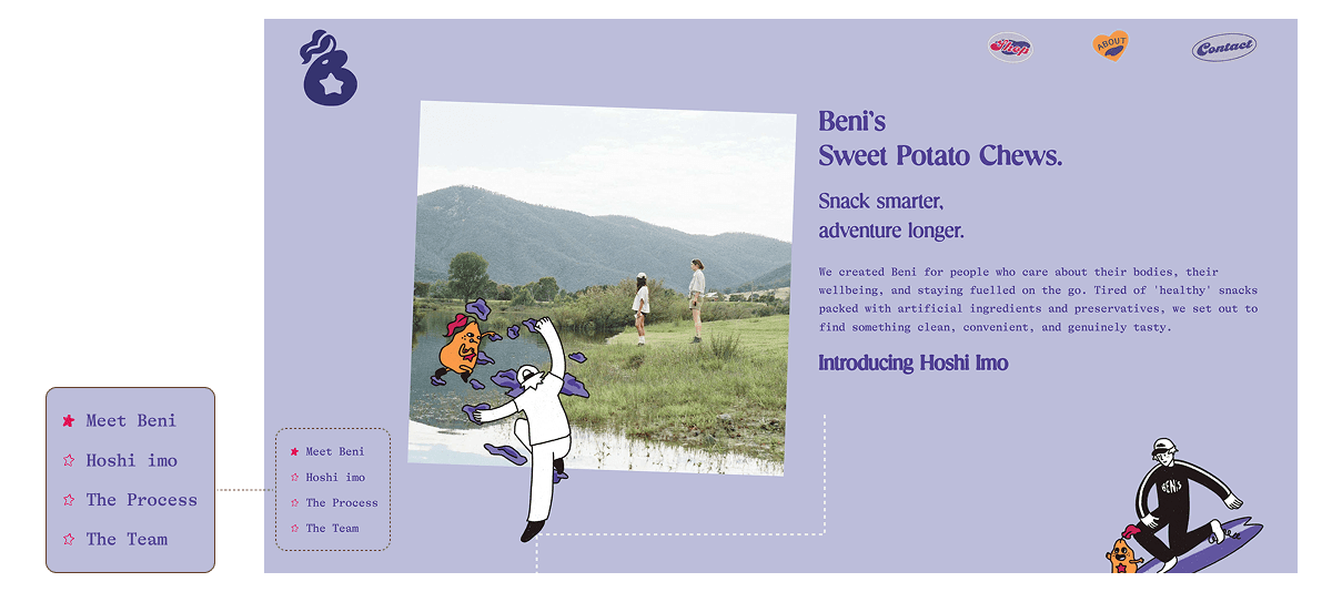 I also included a series of micro interactions with moving elements as the user scrolls down through the page. Images and iconography move with each scroll taken by the user, bringing life to some of the characters we created with Beni's branding.