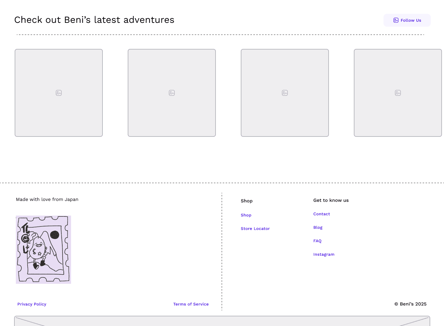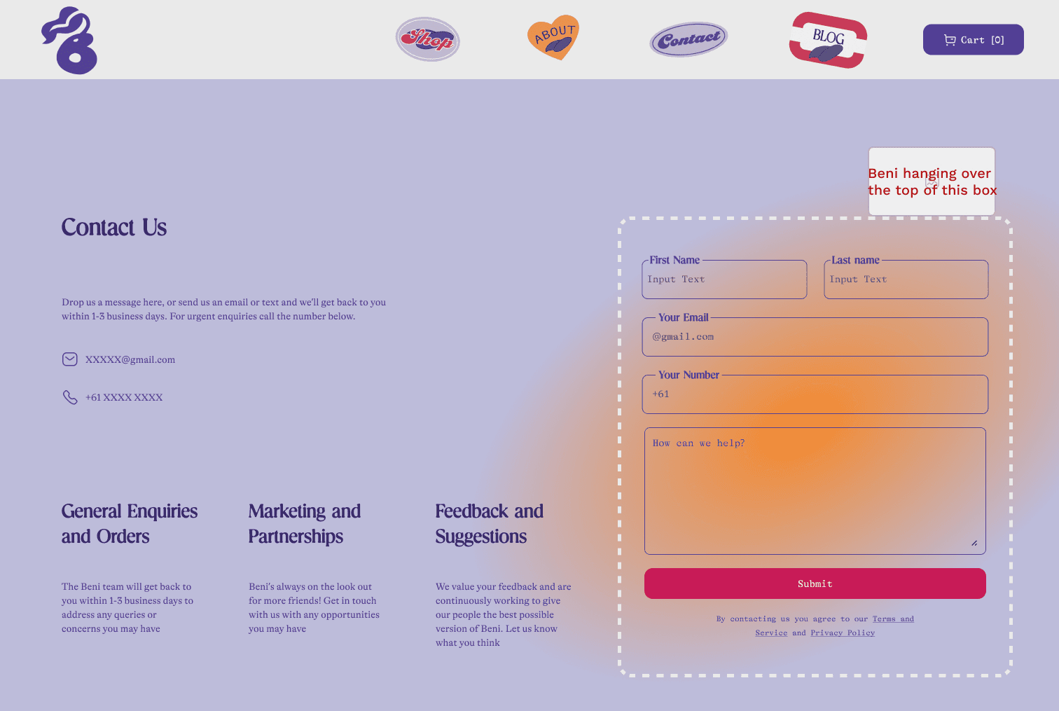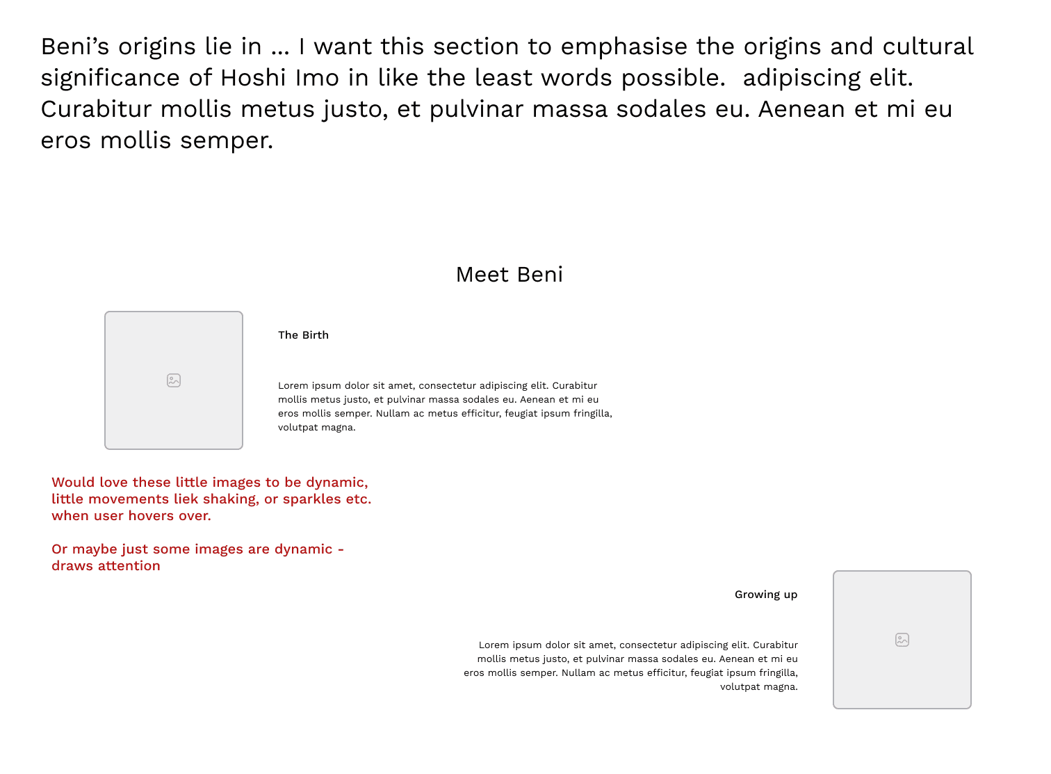 I also included a series of micro interactions with moving elements as the user scrolls down through the page. Images and iconography move with each scroll taken by the user, bringing life to some of the characters we created with Beni's branding.