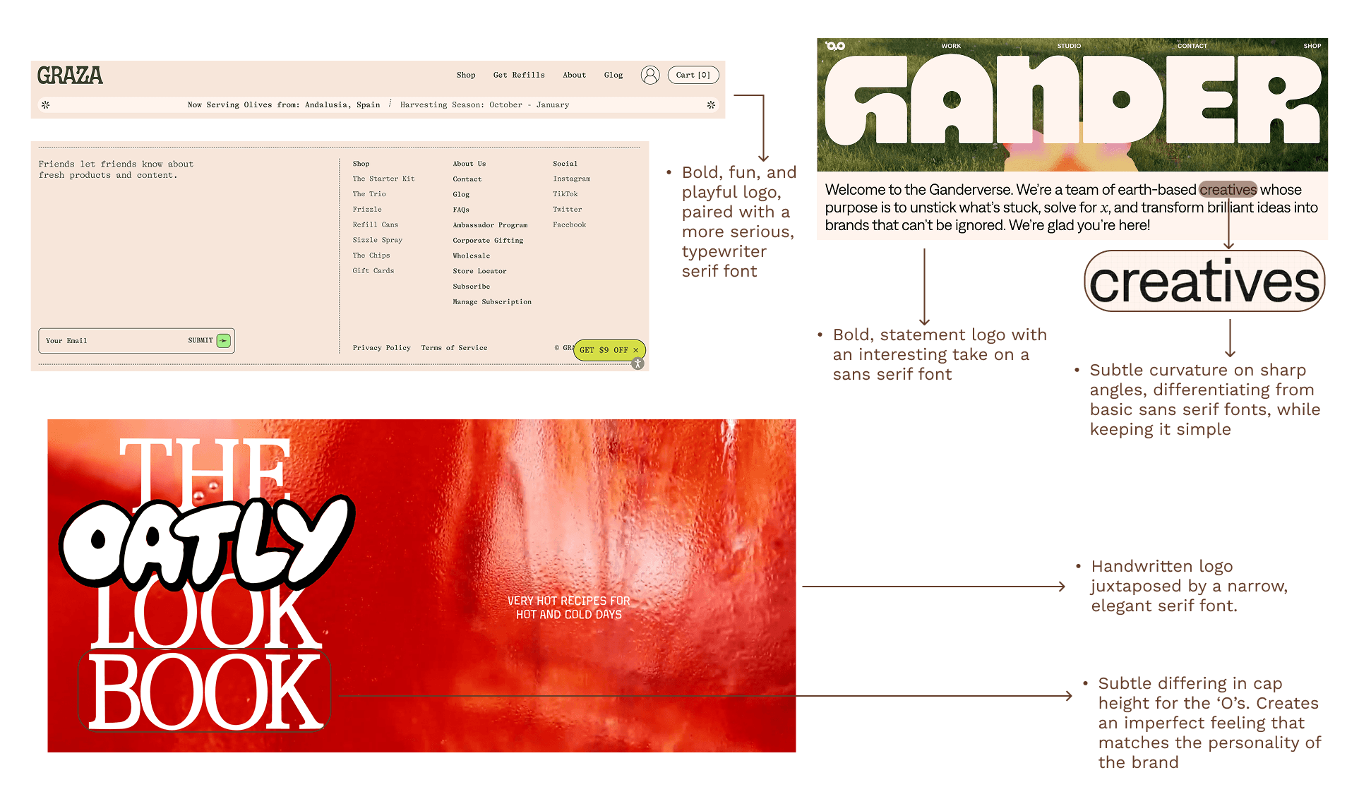 All these websites used a bold, playful logo typeface, combined with a clean and simple text font. This contrast made the websites and brand feel more dynamic and expressive, but also more legible. The simplicity of the text enhanced the creativity of the logo and created an effective balance that reflects both the personality and professionalism of the brand.