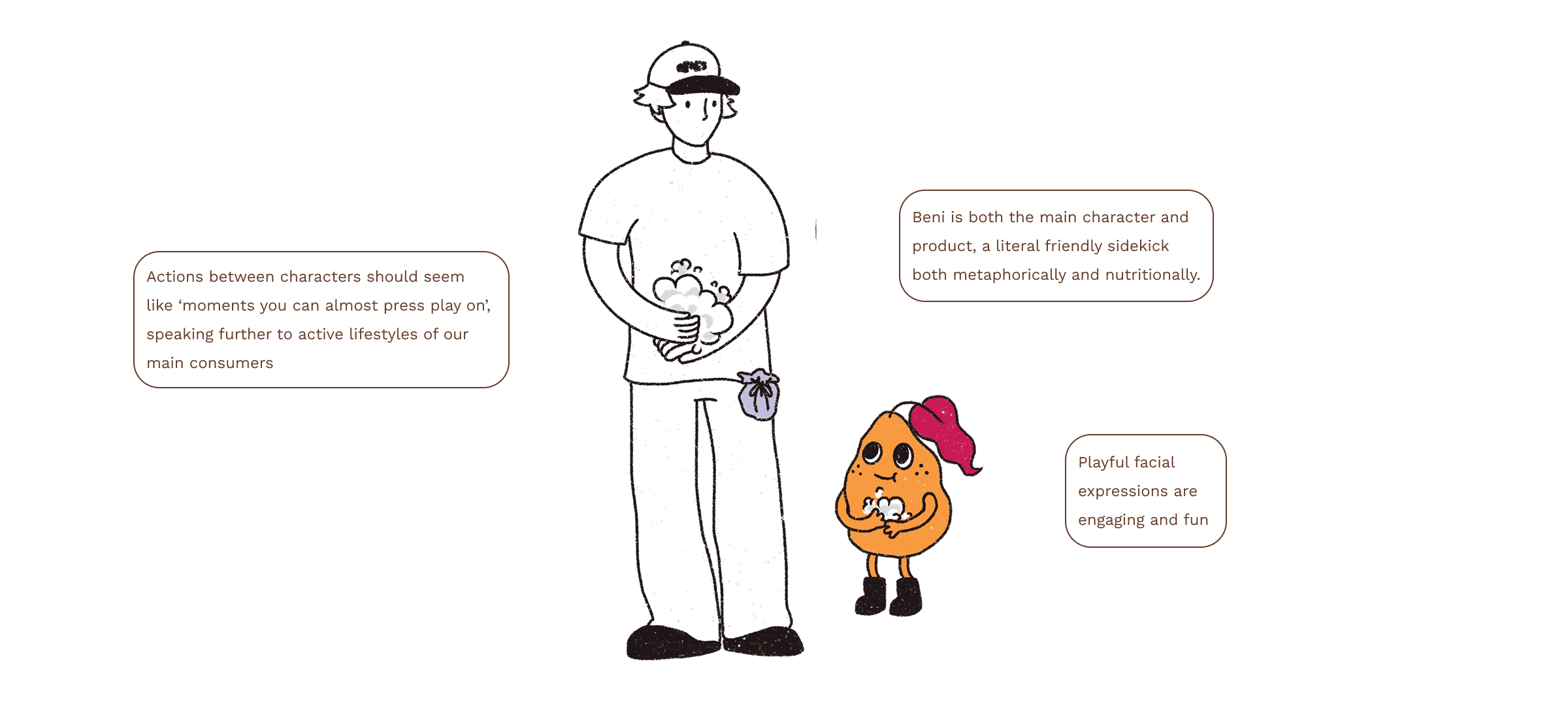 We set out to design a character that embodies the feeling of self-care — not just through its look and pose, but through its entire vibe. When someone reaches for a snack, we don’t want them to think only in terms of what's healthy. We want them to see Beni as something more meaningful — a gentle reminder that choosing to eat well is really about choosing to take care of yourself.