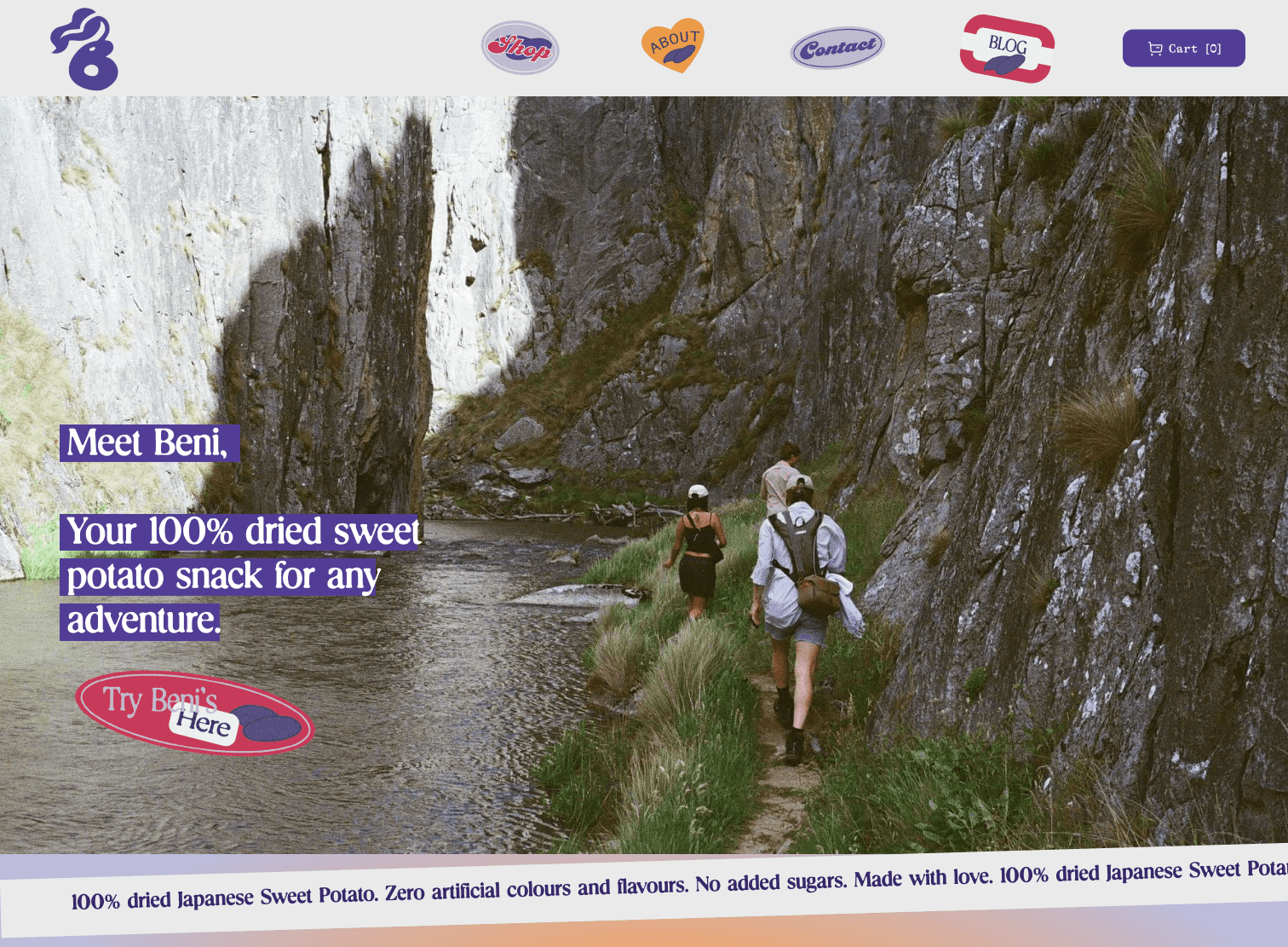 Building from the ground-up, we started off with nothing but our product; A Japanese snack made out of 100% dried sweet potatoes, and an end goal: To create an experience tailored to on-the-go, active, and healthy individuals. With these two things in mind, we created Beni's Sweet Potato Chews (Beni's for short).