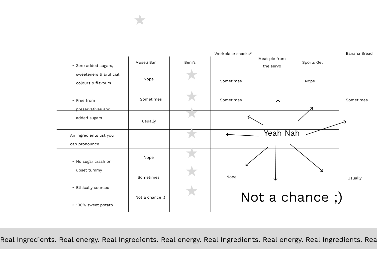 I decided to include a tilted, moving banner in several places around the website as a page break, with the tilt subtly drawing the users attention downward to the other sections of the page.. The movement of the banner keeps the users' experience from feeling monotonous and helps maintain attention whilst showing the pages' liveliness (motion = energy). Along with the green included, also draws their attentions to the health benefits of the product.