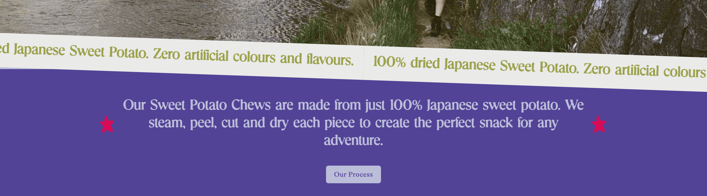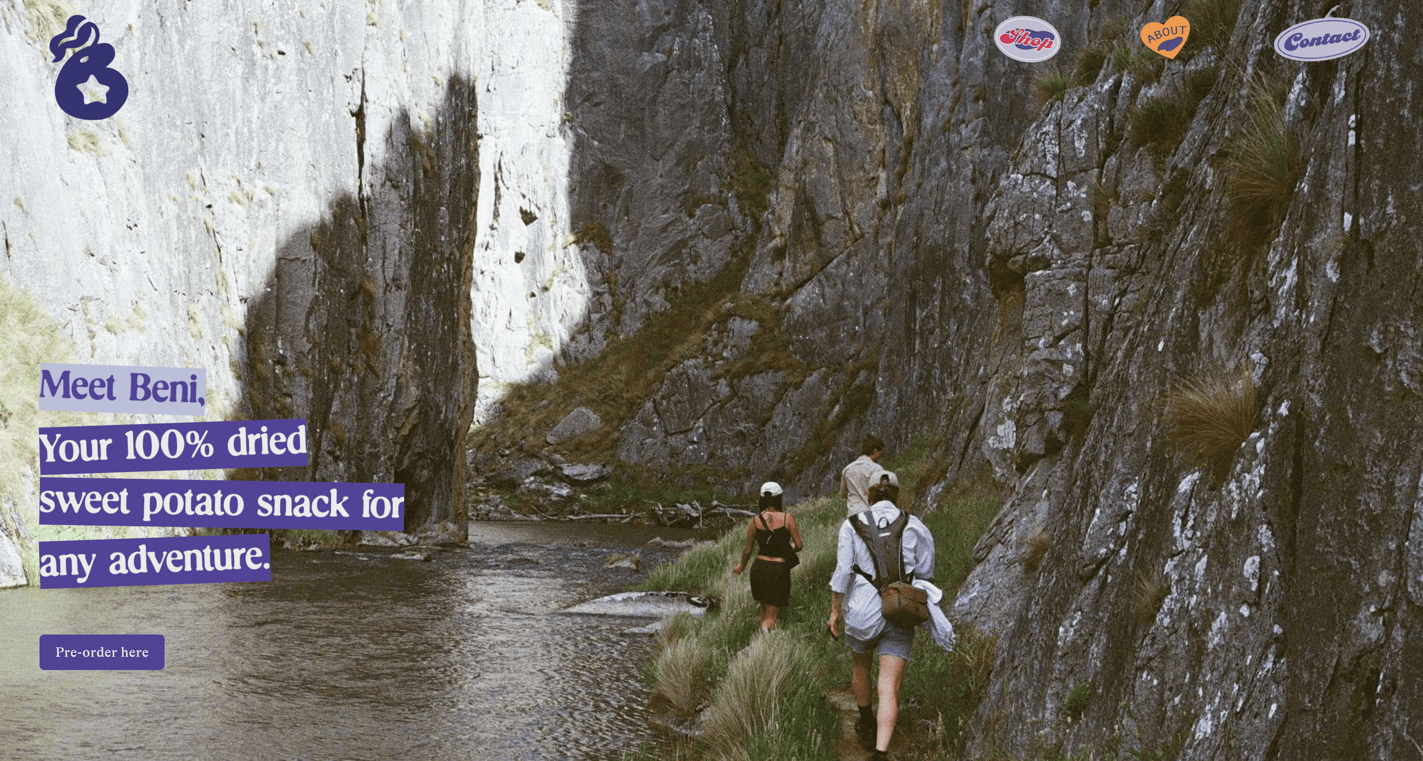 The positioning of the product as a healthy snack is emphasised straight away in the landing page as a film photo of 3 hikers can be seen. No product in-situ as of yet (due to constraints), but the image and use of the word 'adventure' centre the branding on first glance.