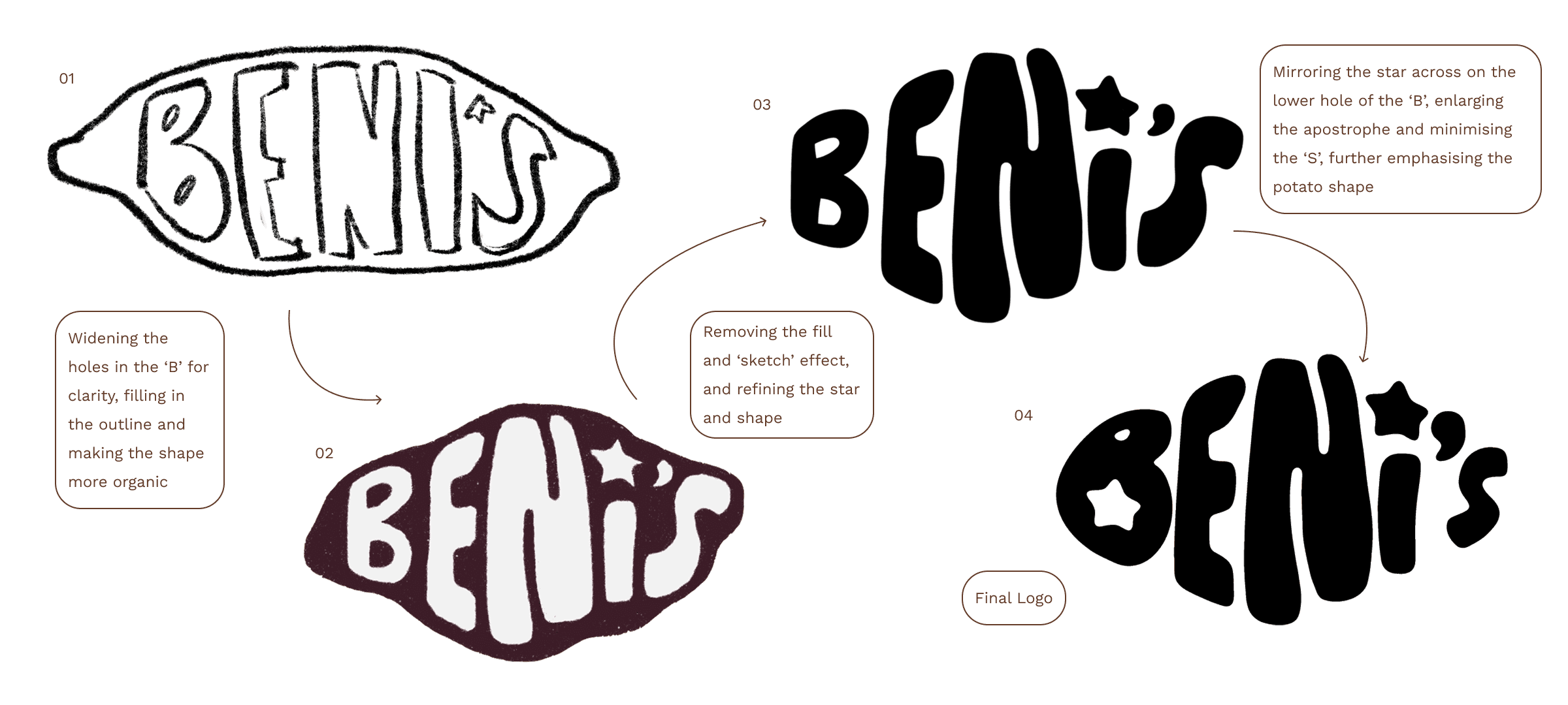 The final logo collection is something that speaks to all aspects of the product; The smooth roundness of the lettering, and particularly of the star mimic the texture and taste of the sweet potato chew product, as well as represent the playfulness of the brand and what it represents. The shape of the logo, particularly in the short logo shows (not tells) the actual product itself without being too on the nose. The incorporation of the star contributes a sense of energy and vibrancy behind the brand whilst also adding to the aesthetic appeal, breaking monotony.